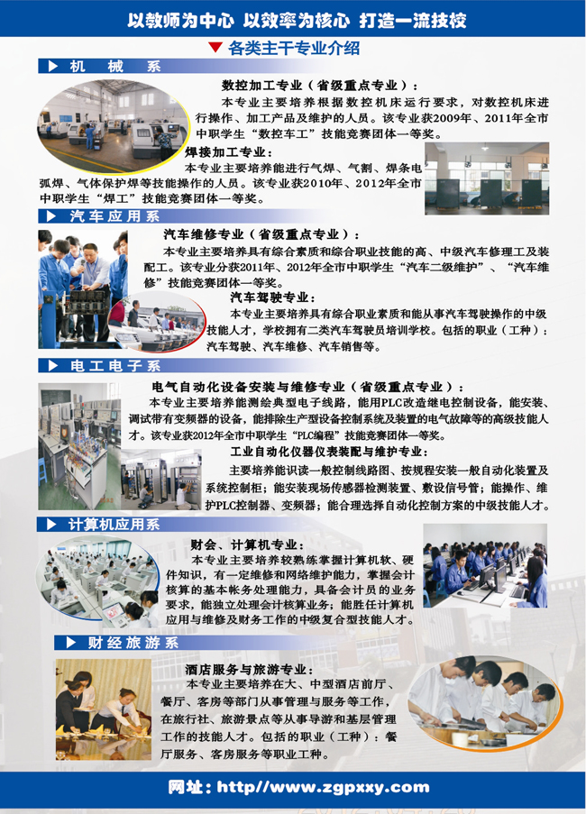 學院占地260畝,擁有固定資產1.6億元;辦學規模4000人;開設有數控加工、電氣自動化設備安裝與維修、汽車維修、酒店服務與旅游、財會、計算機等17個工種專業;學院師資力量強,現有中高級職稱的教師120余人。學院教學實習實訓設施齊全,有各類教學用機床104臺和汽車發動機實訓臺、自動變速器實訓臺、APS制動實訓臺等先進汽修實訓設施10套;PLC自動化控制實訓臺19套以及各類專用實訓室41間。學院建有國家數控實訓基地、國家職業指導教學實驗基地、國家職業技能鑒定(川-028)所,下屬有自貢市汽車駕駛員培訓學校、自貢市廚師學校、實習工廠、汽車修理廠。