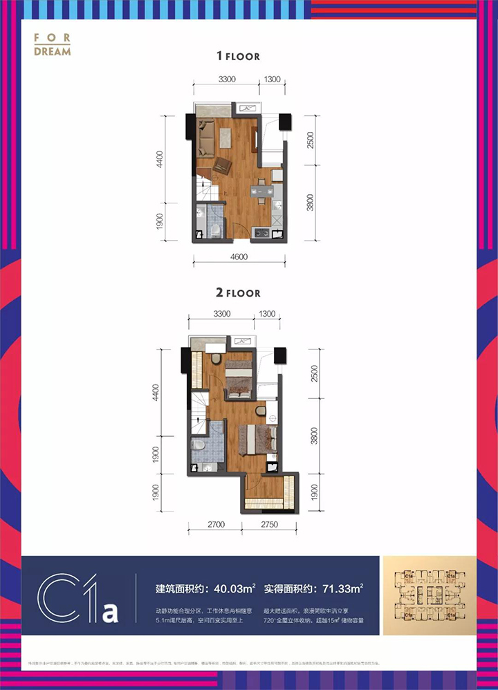 C1(C1a)戶型 建面40.03㎡ 實得71.33㎡-2室2廳