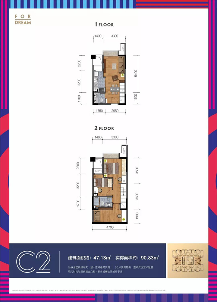C2、建筑面積約47.13㎡,實得面積約90.83㎡,共64套。