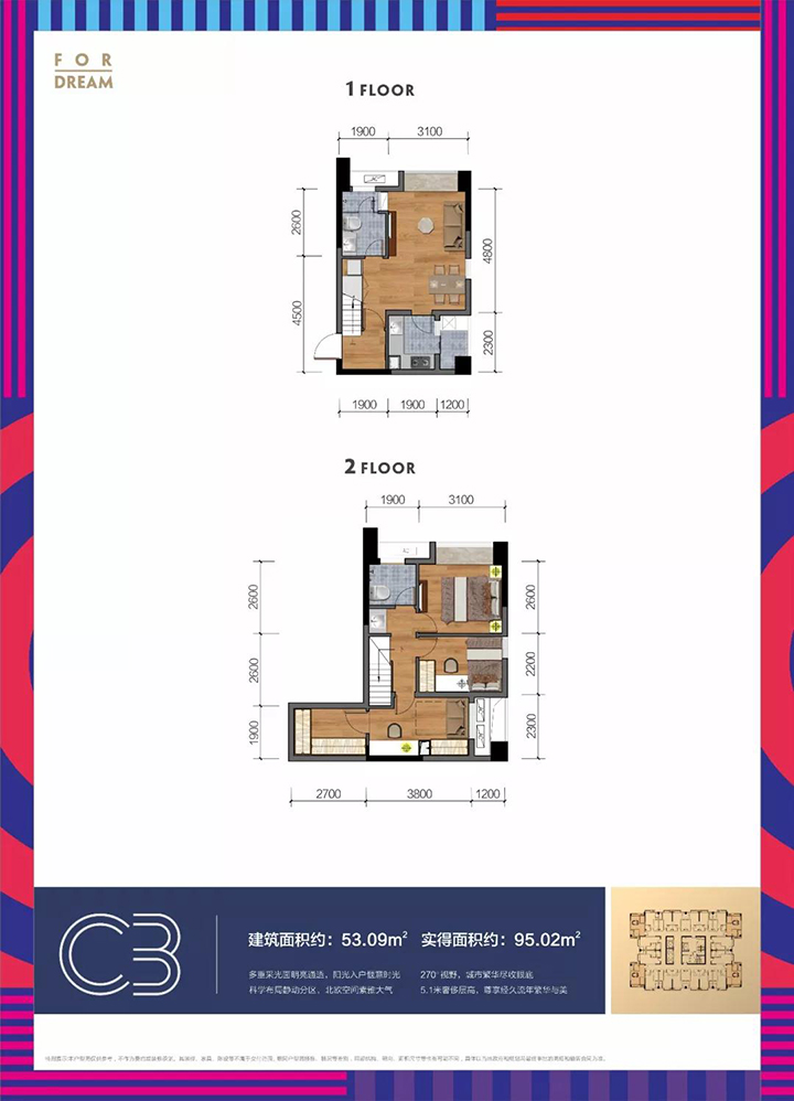 C3戶型 建面53.09㎡ 實得95.02㎡-2室2廳