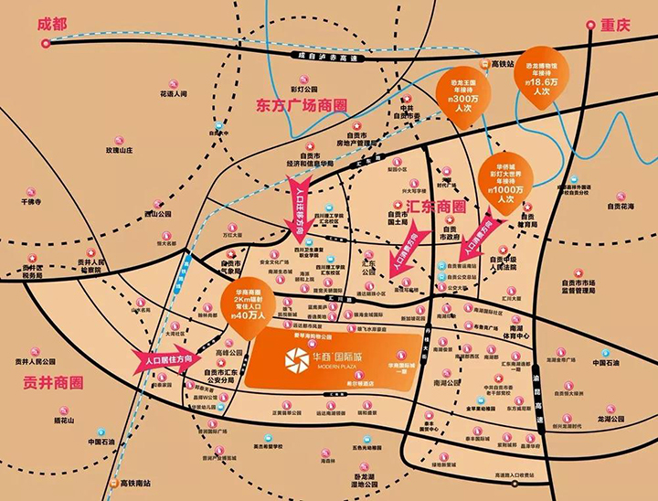 華商國際城二期具有多元的功能、開放的形態、科學的動線、繽紛的業態、情景化的消費體驗、智能化的設施,以自貢現階段最高標準打造公園式的景觀,東情西韻的文化建筑,完美融合集中式商業與街區商業,滿足全年齡段城市客群消費需求,呈現最優產品及業態規劃的5.0版商業。在華商國際城二期中,您將領略來自國內頂尖商業運營商愛琴海帶來的假日購物中心,暢游自貢前所未有的集合潮流運動與網紅美食的活力天街,流連于特色獨棟商業與主題文化景觀交織的文旅小鎮,感動于提供全方位一站式5A級總部商務服務的國際金融中心,享受擁有強大功能投資兼自主彈性空間的夢立方LOFT。