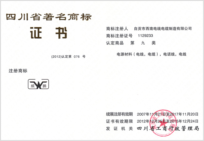 公司主要產品為“威鵬”牌額定電壓0.6/1KV伏及以下聚氯乙烯絕緣電力電纜、450/750聚氯乙烯絕緣控制電纜、450/750聚氯乙烯絕緣無護套電纜電線、300/500v聚氯乙烯絕緣護套電纜、電話線、鋼芯鋁絞線、銅鋁絞線等7大類近百個規格的產品。各類產品均已獲全國工業產品生產許可證和國家認證中心頒發的強制性產品認證,即CCC認證。先后獲得了四川著名商標、四川名牌產品企業、四川省政府名優特新博覽會“用戶滿意產品”、 四川省非公有制企業“質量工作先進單位”、四川省質量技術監督局頒發的“質量信譽AAA級企業”、質量信得過產品”、 四川省先進民營企業、自貢市標準化工作先進單位、大安區信息化建設示范企業、 連續七年被評為市級“重合同、守信用”企業和大安區的“工業十強企業”和“十強納稅大戶”等多項榮譽稱號。