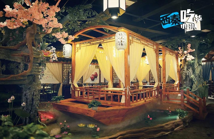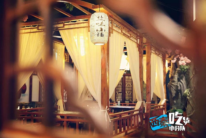 整個餐廳最大的亮點之一,莫過于大廳中的船型包廂,燈籠盞盞,水波蕩漾,不禁讓人聯想起《笑傲江湖》中曲洋和劉正風兩大高手小船中彈唱的場景。
