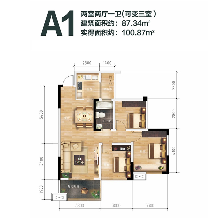 A1建筑面積87.81㎡、平層23套、躍層1套、建筑面積122.11㎡,共24套。