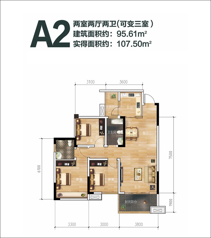 A2建筑面積96.17㎡、平層23套、躍層1套、建筑面積123.76㎡,共24套。