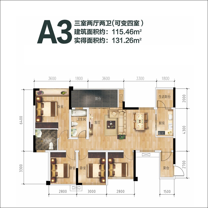 A3建筑面積115.94/115.96㎡、平層22/23套、躍層2套、建筑面積140.61㎡,共47套。