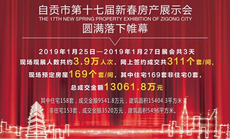 1月27日,為期三天的第17屆新春房產(chǎn)展示會(huì)圓滿落幕。這場(chǎng)由自貢市住房和城鄉(xiāng)建設(shè)局主辦、以“衣錦還鄉(xiāng)·置業(yè)為家”為主題的樓市大狂歡吸引到訪人數(shù)約3.9萬人次,網(wǎng)簽房源311套,成交額達(dá)13061.8萬元!
