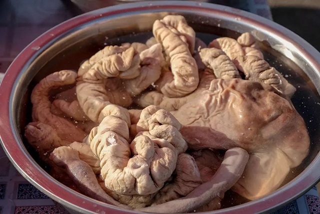 1、翻過的腸(腸面向里,腸里向外)用清水洗一遍;