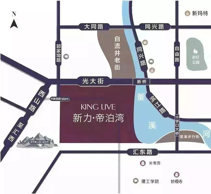 新力帝泊灣背靠富臺山、面朝釜溪河,依水而建、臨江而居。項目占地約129畝,匠造約20萬方人居典范,包含約16萬方觀山、攬河、三中庭高端住宅物業,以及約4萬方的仿古商業街區,緊鄰自流井老街項目10萬方純商業。