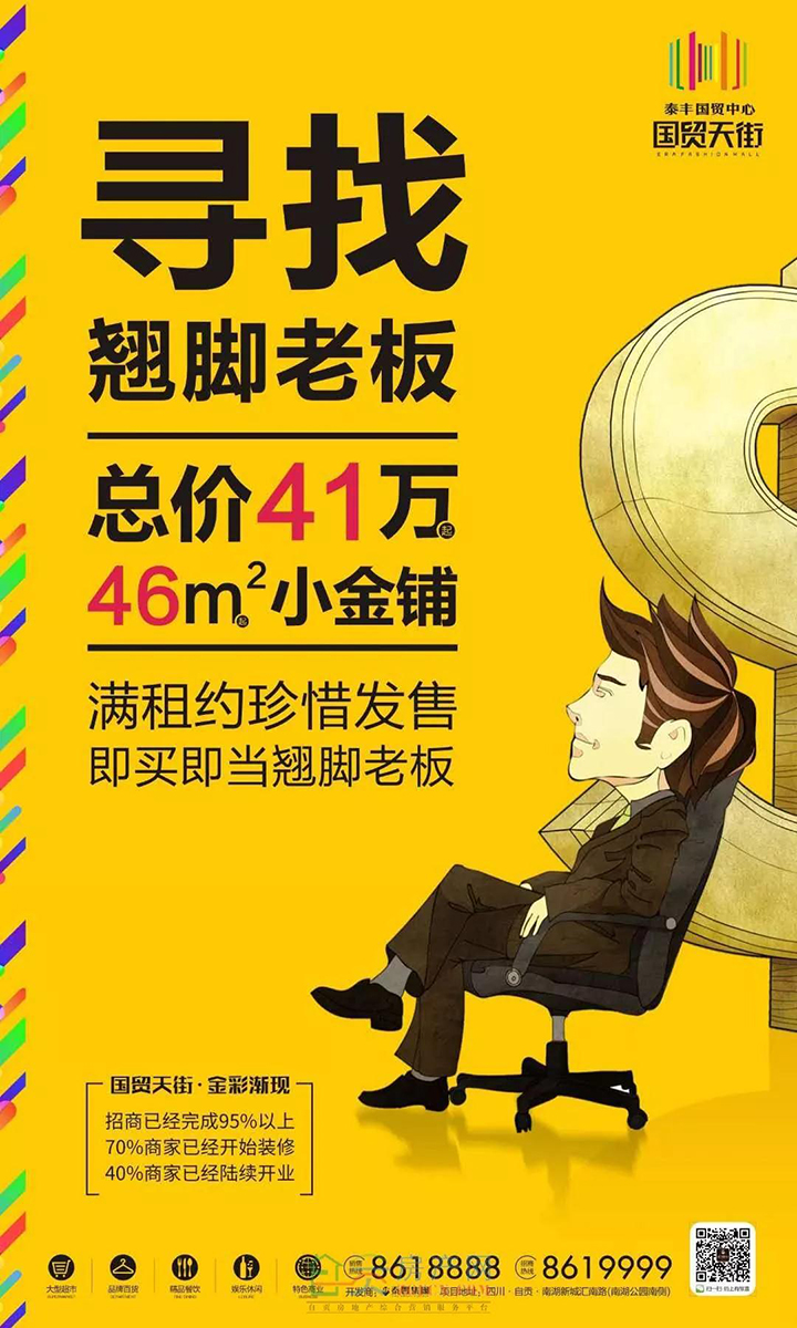 建筑外墻裝飾基本完成,國貿天街的時尚外觀已初具雛形,168米自貢新地標高聳矗立吸引眼球。現國貿天街46㎡小金鋪總價41萬,即買即當翹腳老板。