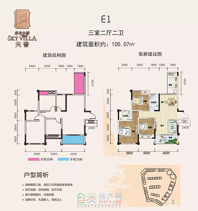 1、三室兩廳:E1建筑面積約 105.07m²