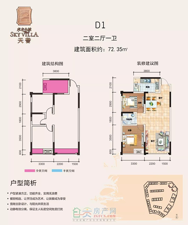 1、兩室兩廳:D1建筑面積約72.35m²