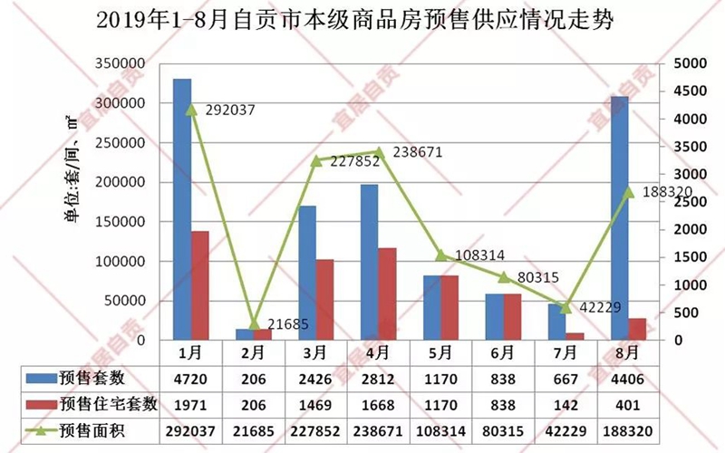 自流井區8月市本級商品房銷售共計1082套,比去年同期下降43%,其中包含住宅482套、商業營業房327套及其他,銷售額約4.57億元,同比下降59%。