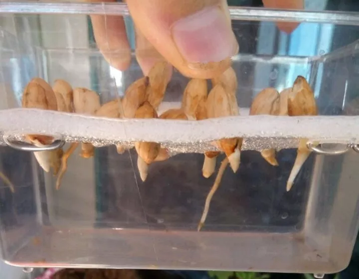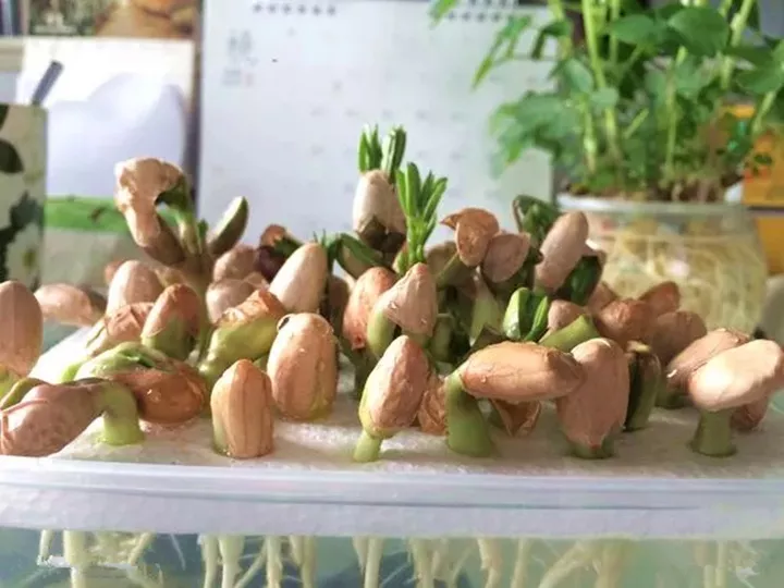 2、泡沫會自己浮起來,不用擔心把花生泡爛了,把它們放在室內比較溫暖的地方,不要見太陽。3天換一次水,最好是飲用水或礦泉水,一周內就能生根。
