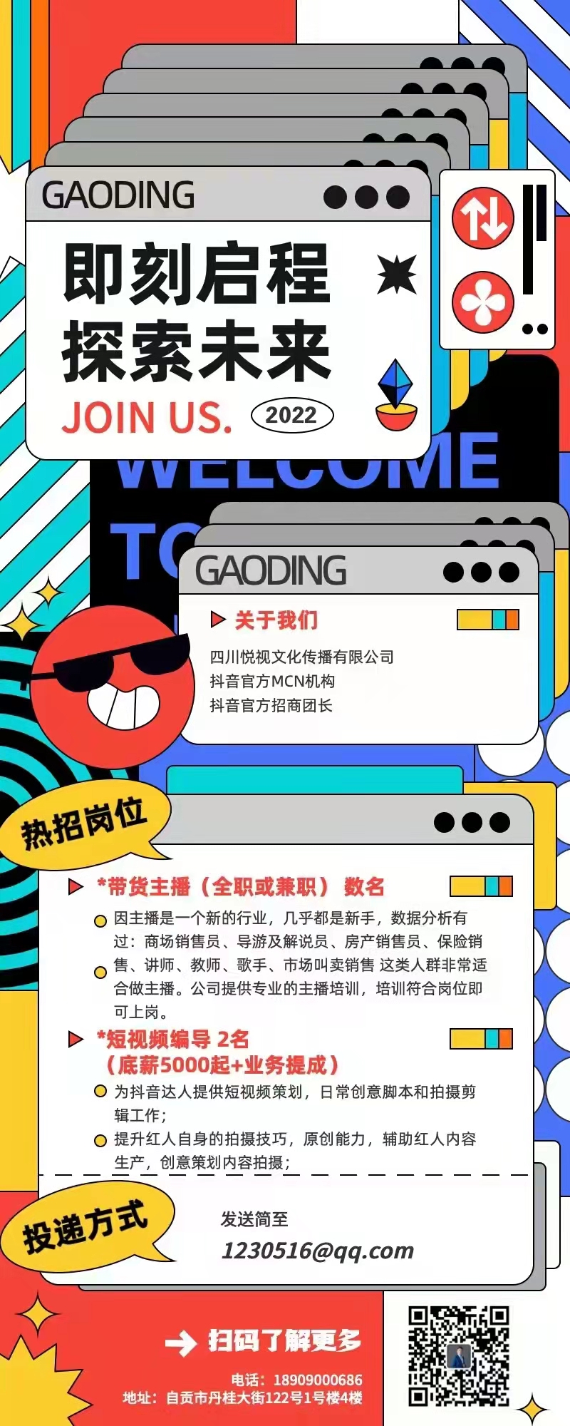 高薪招聘短視頻編導,攝像,剪輯,帶貨主播,直播運營。